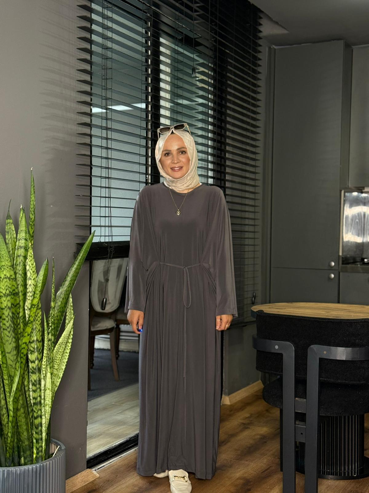 25117 İPLİ SENDY KUMAŞ ELBİSE FÜME STD Selma Butik