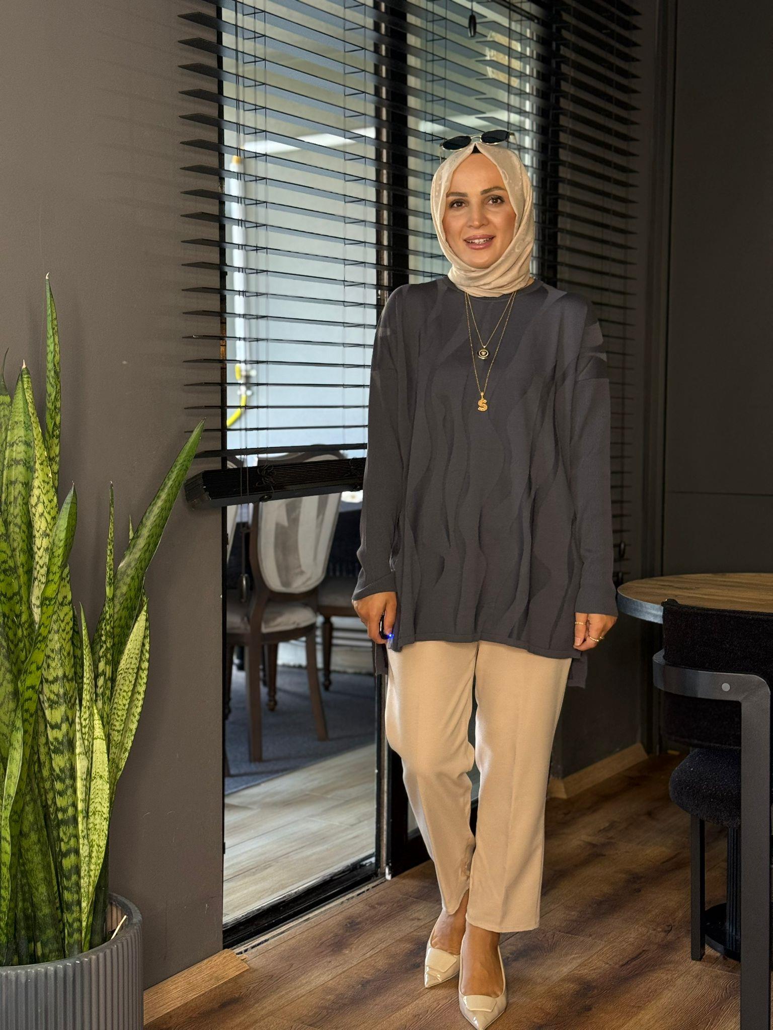 44013 DALGA DETAY MERSERİZE TUNİK GRİ STD Selma Butik